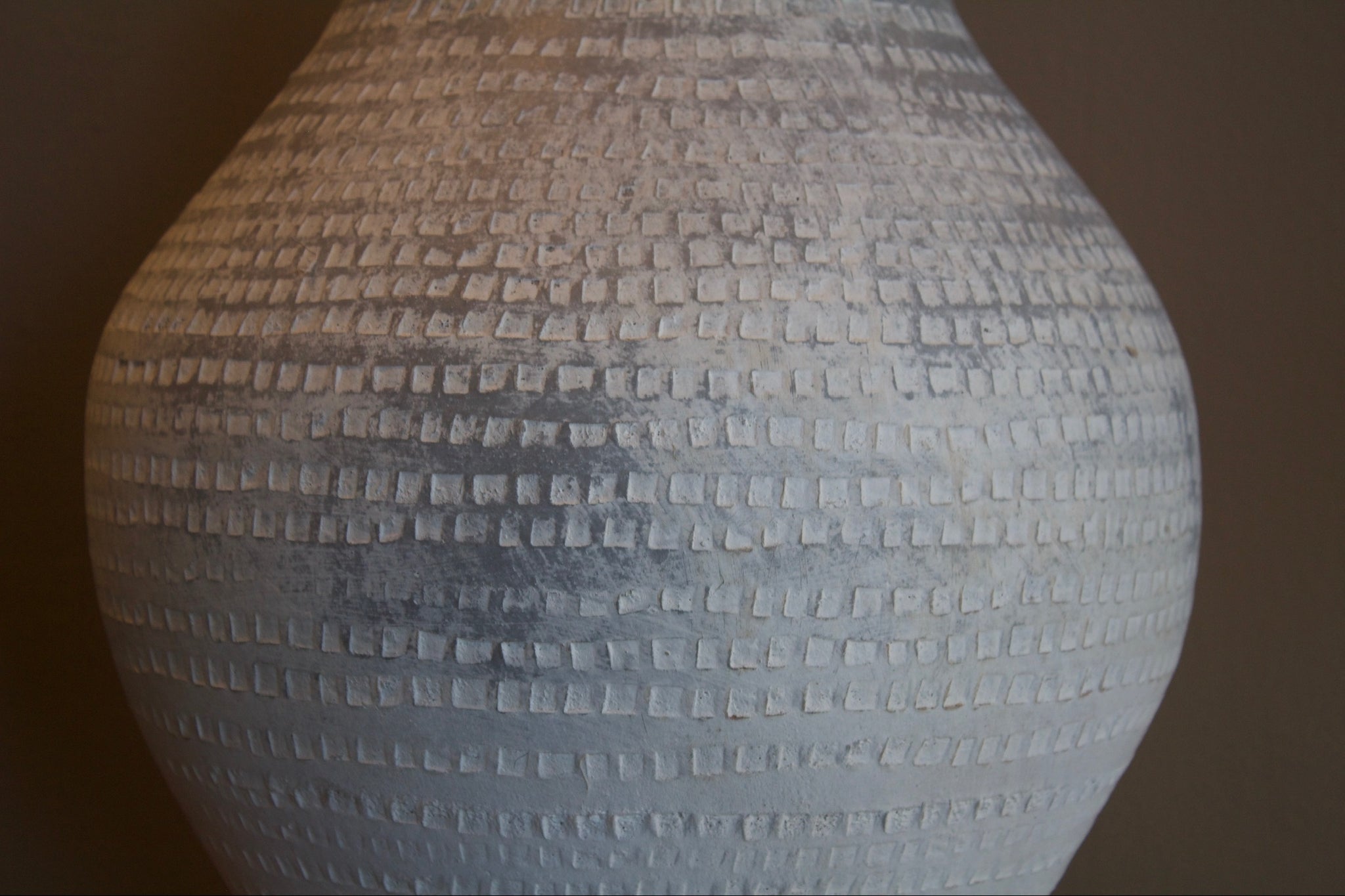 Añade un toque de elegancia rústica y moderna a tu espacio con este jarrón decorativo único. Su diseño presenta una fascinante textura cuadriculada que captura la luz y la sombra, creando un efecto visual cautivador.