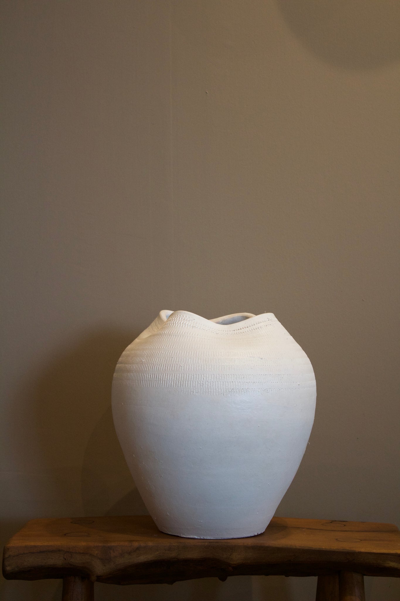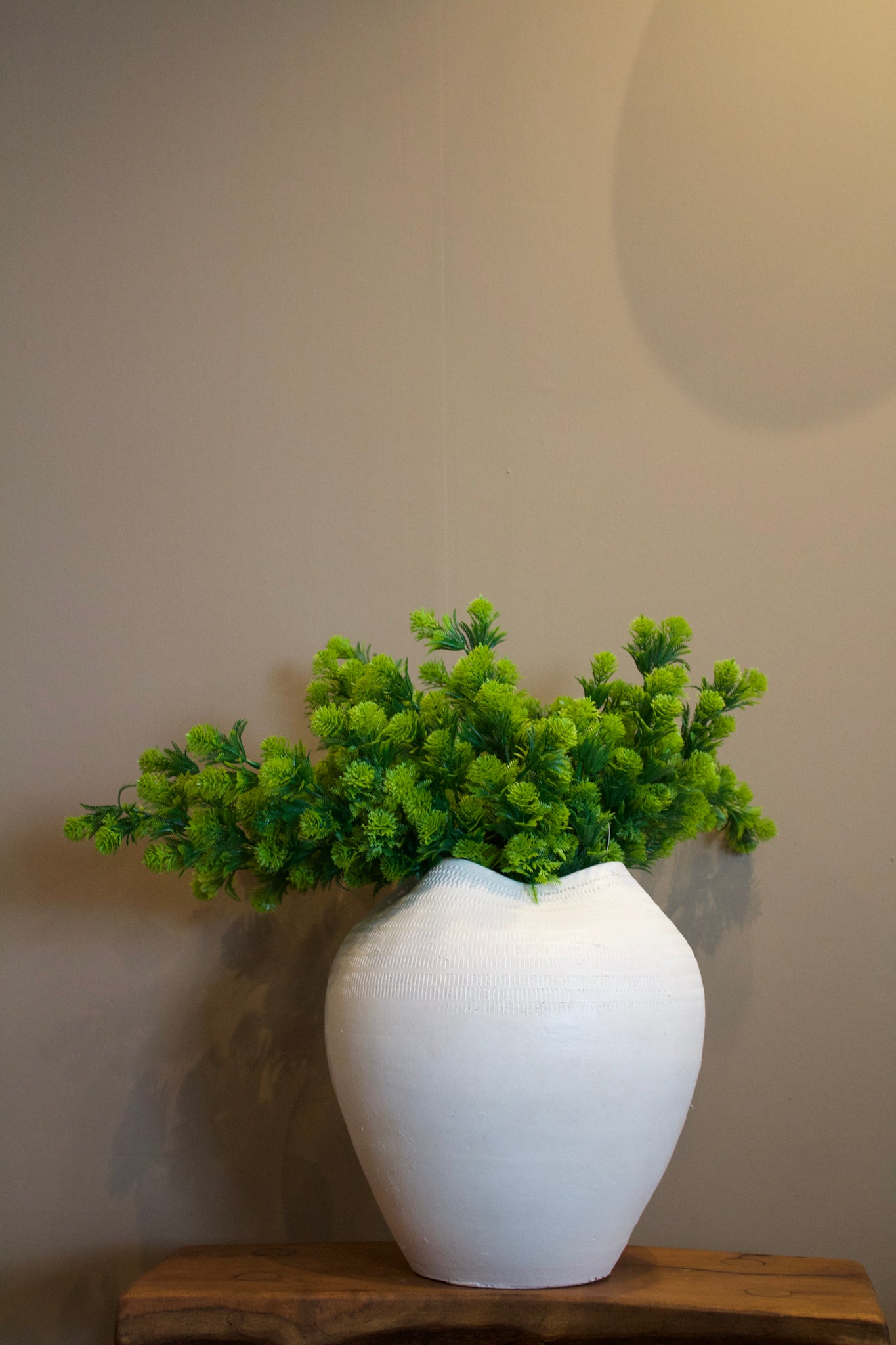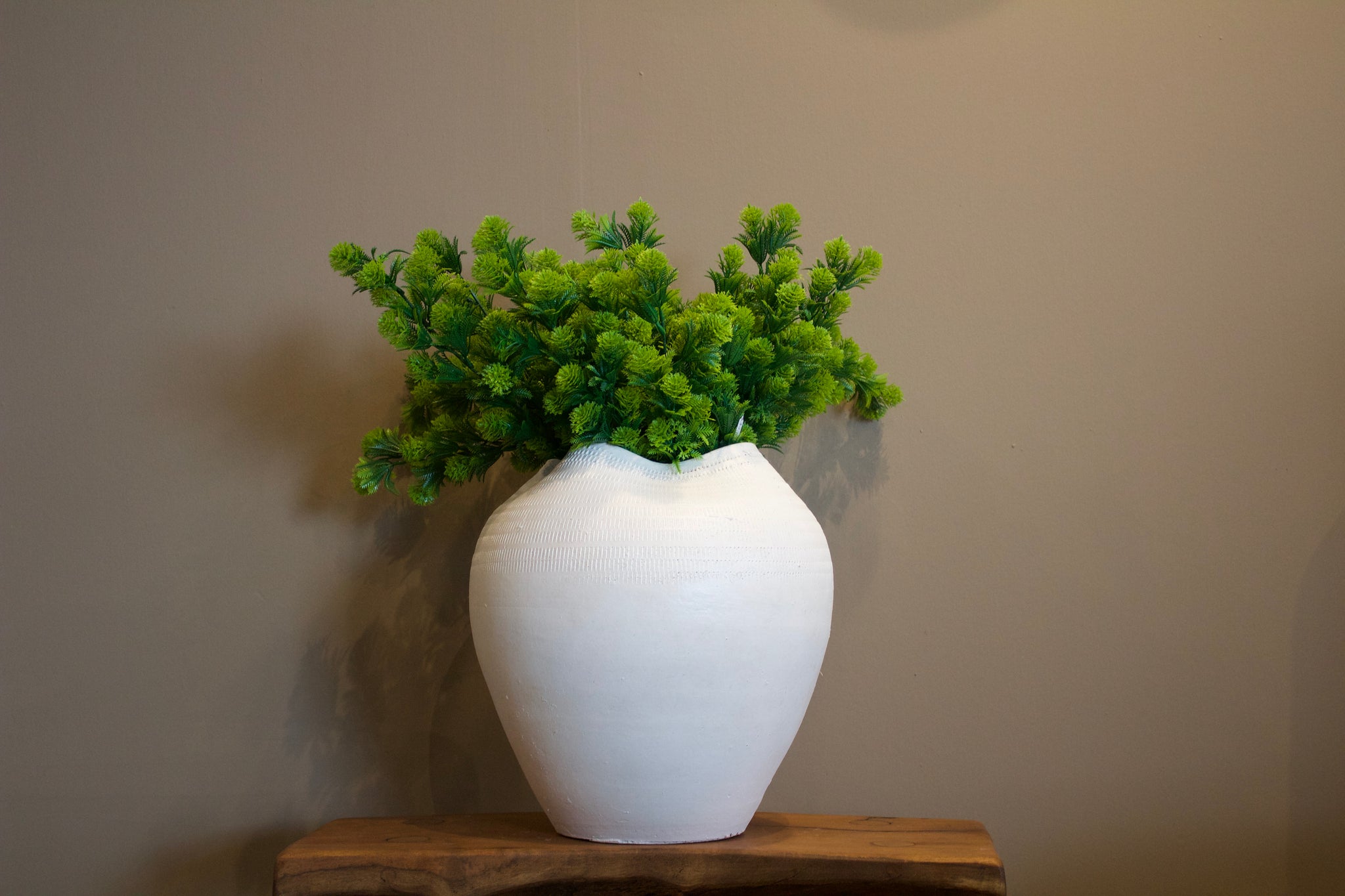 Este jarrón decorativo de diseño artesanal tiene unas medidas de 36 cm de altura, 30 cm de ancho y ancho de la boca de 15 cm. Su acabado en tonos neutros y textura orgánica lo convierten en una pieza versátil y elegante, ideal para complementar cualquier estilo decorativo, desde rústico hasta moderno. Su forma redondeada y los delicados detalles grabados en su superficie aportan un toque único y sofisticado.