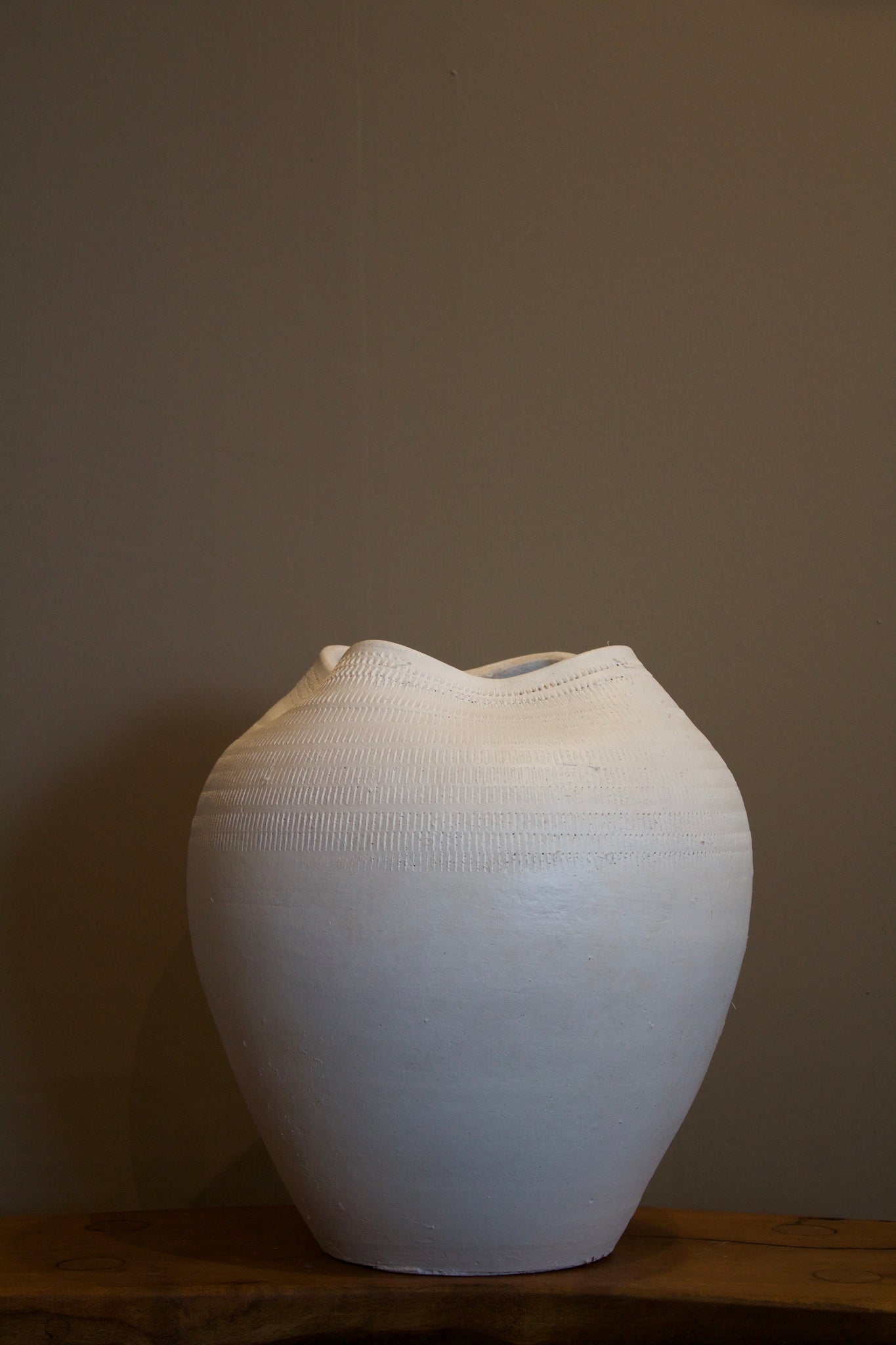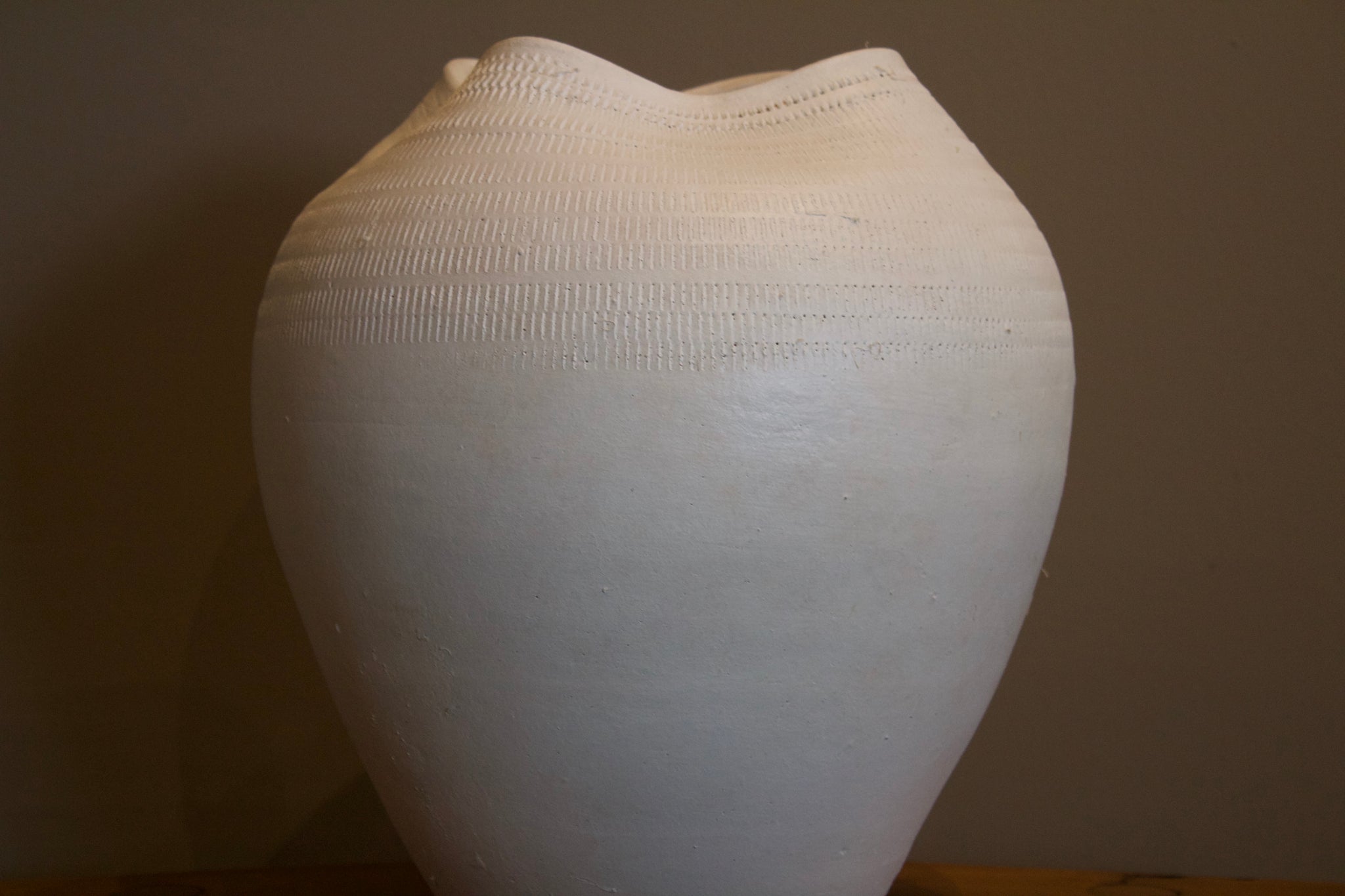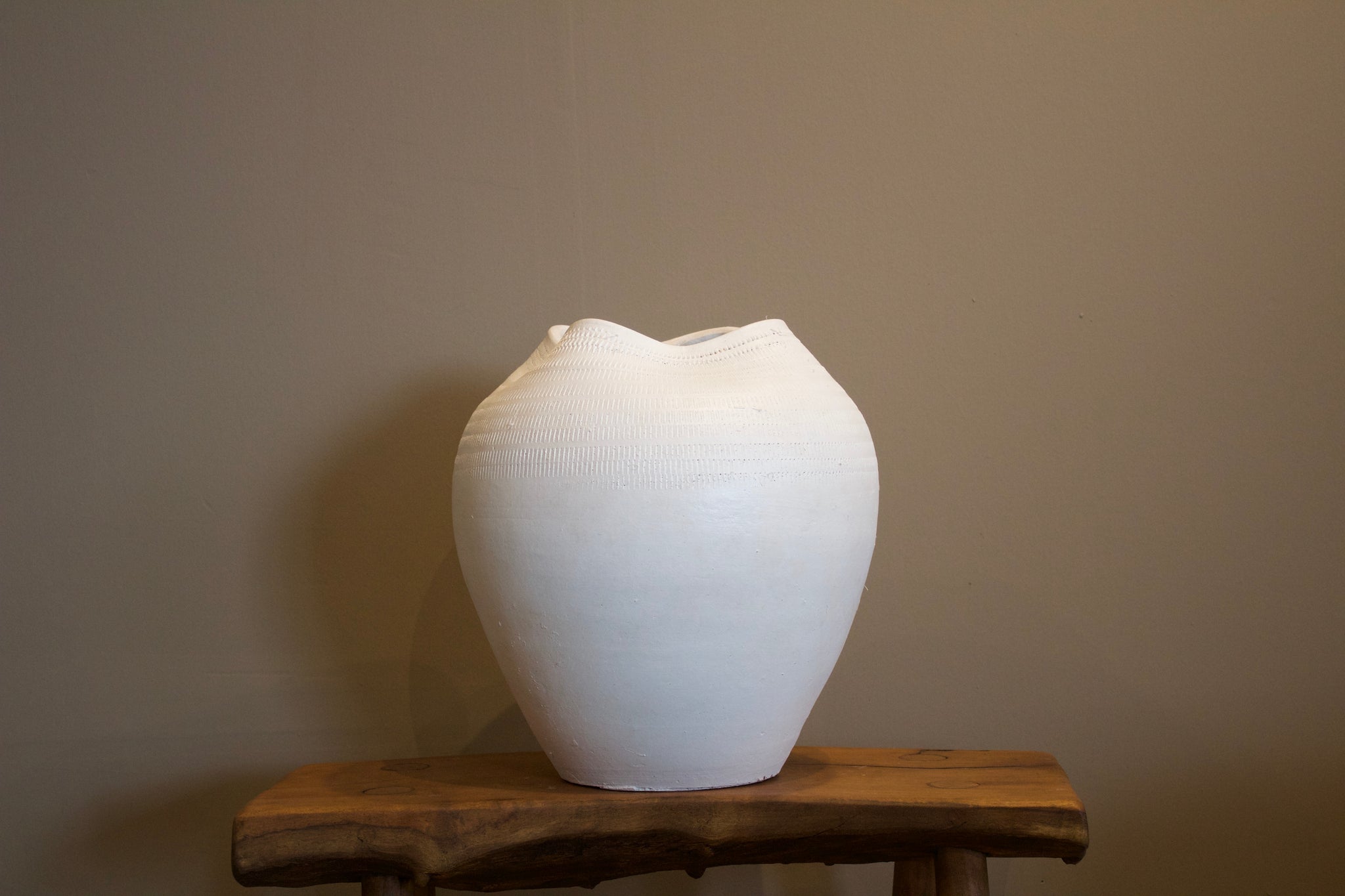 Este jarrón decorativo de diseño artesanal tiene unas medidas de 36 cm de altura, 30 cm de ancho y ancho de la boca de 15 cm. Su acabado en tonos neutros y textura orgánica lo convierten en una pieza versátil y elegante, ideal para complementar cualquier estilo decorativo, desde rústico hasta moderno. Su forma redondeada y los delicados detalles grabados en su superficie aportan un toque único y sofisticado.