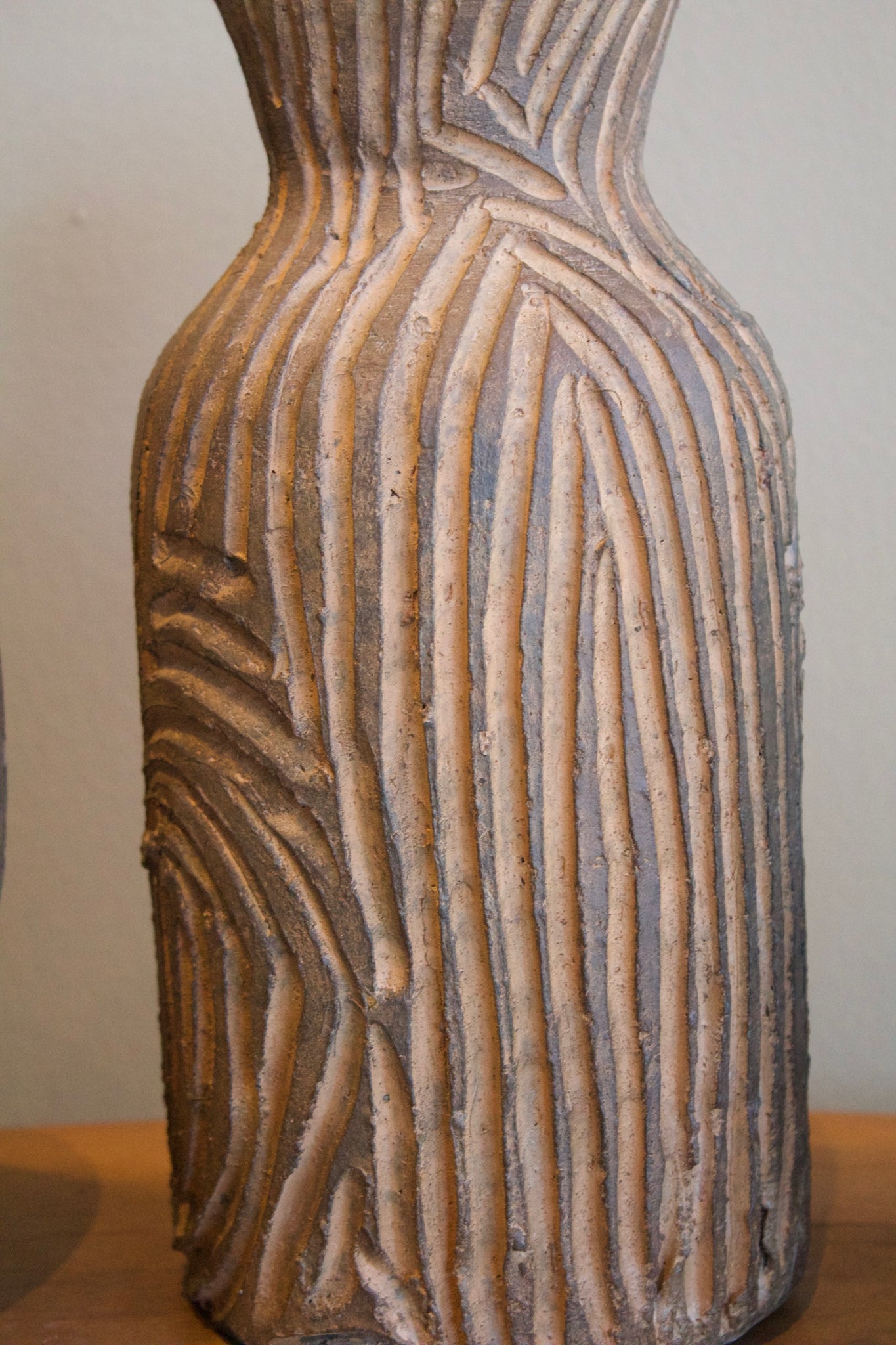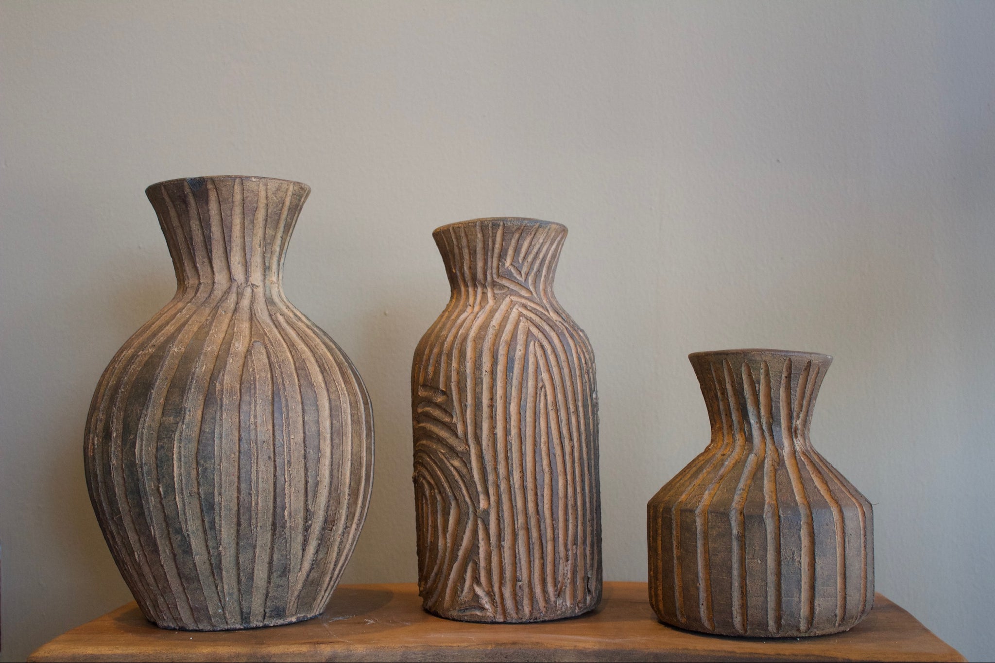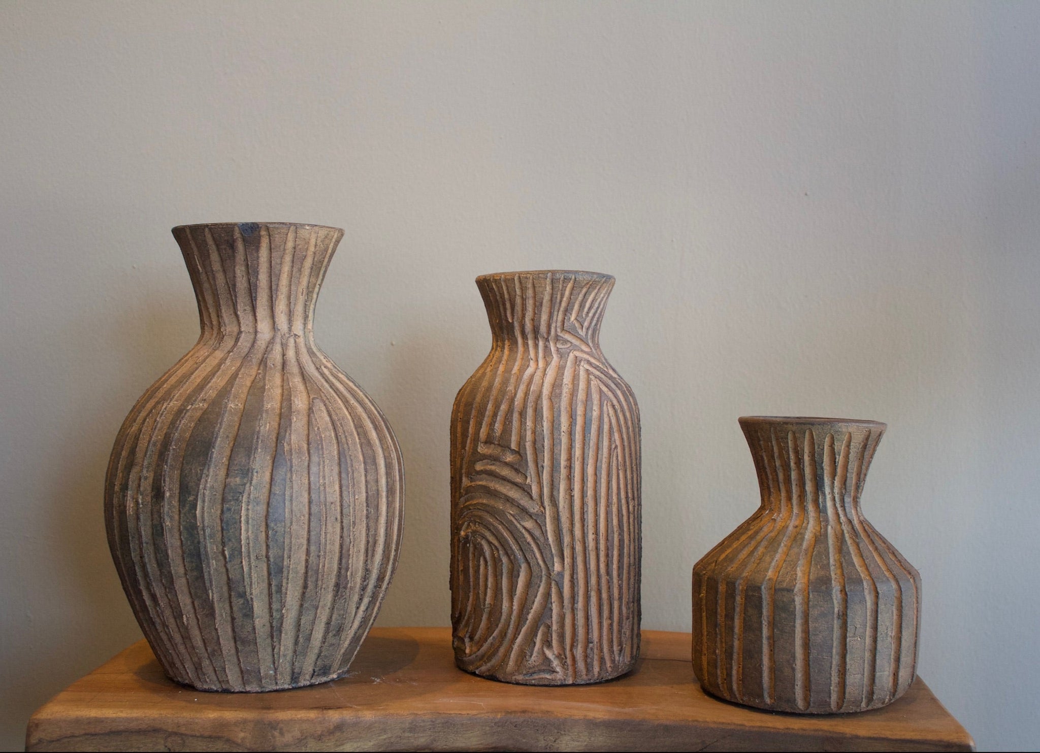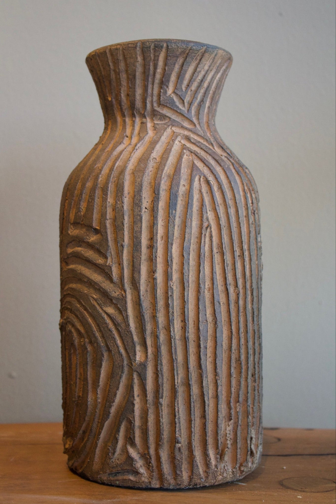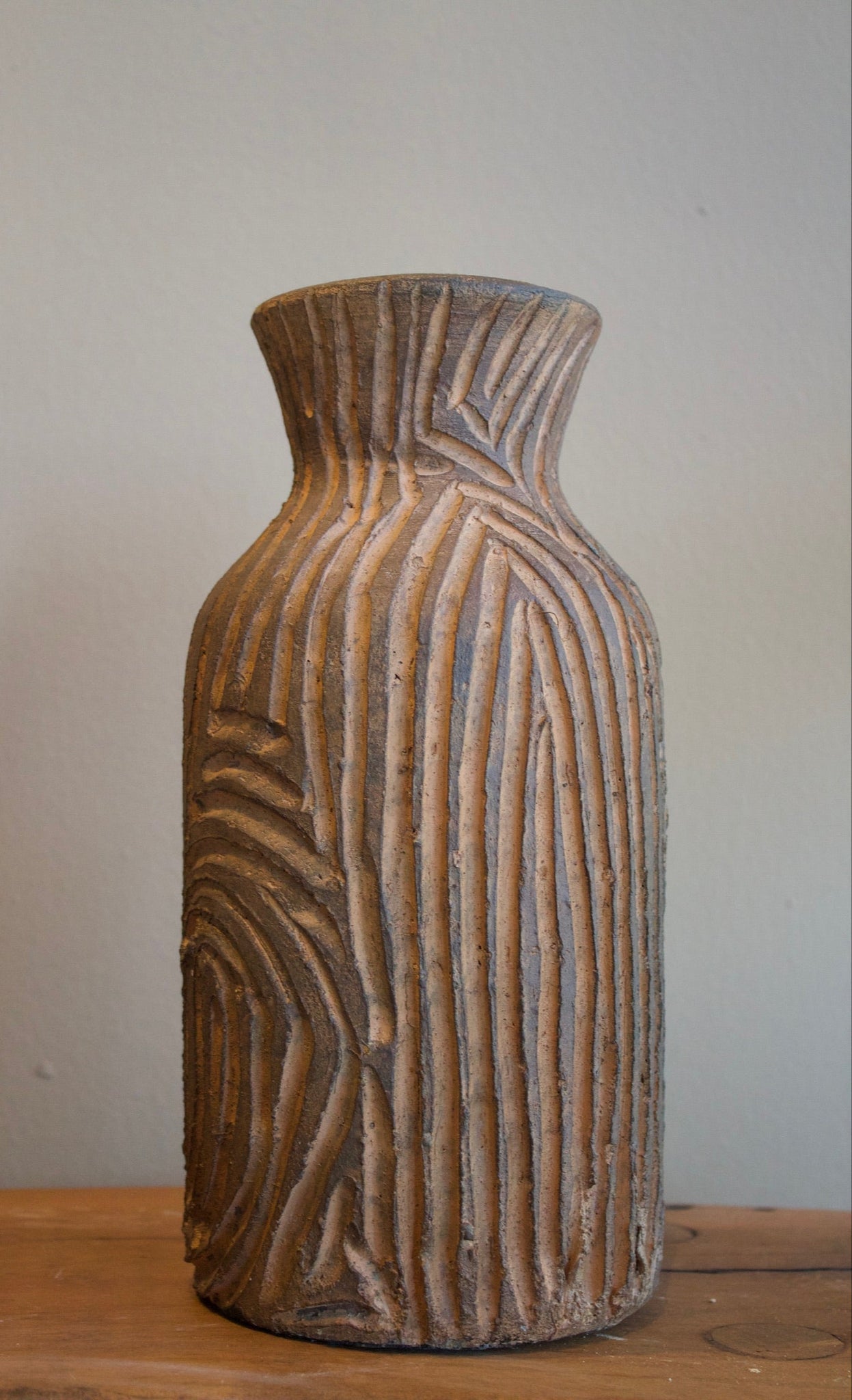 Este jarrón destaca por su diseño alargado y textura en relieve con patrones curvos que evocan formas naturales. Es perfecto para quienes buscan una pieza decorativa con carácter y estilo único.