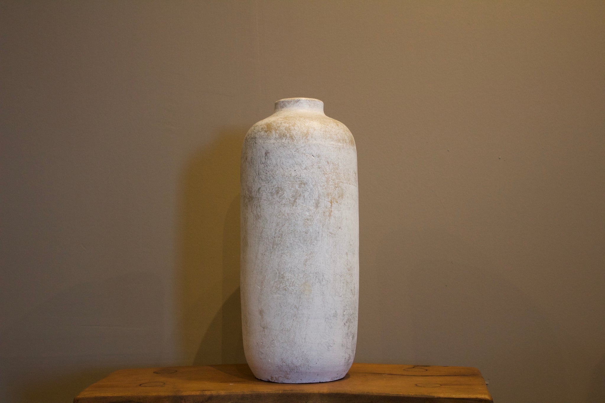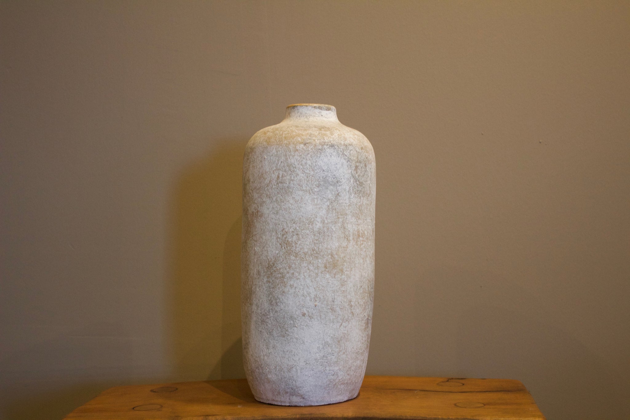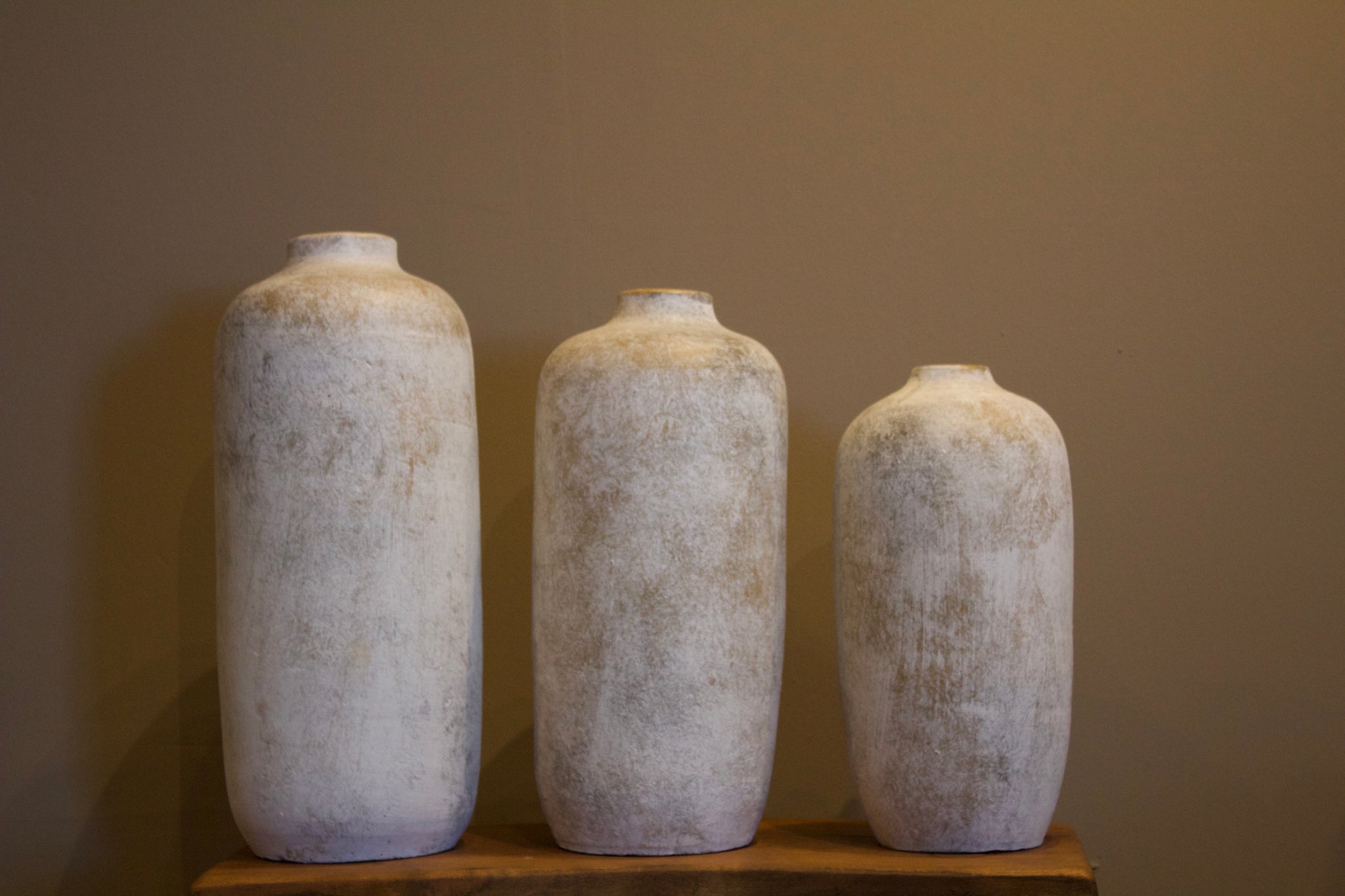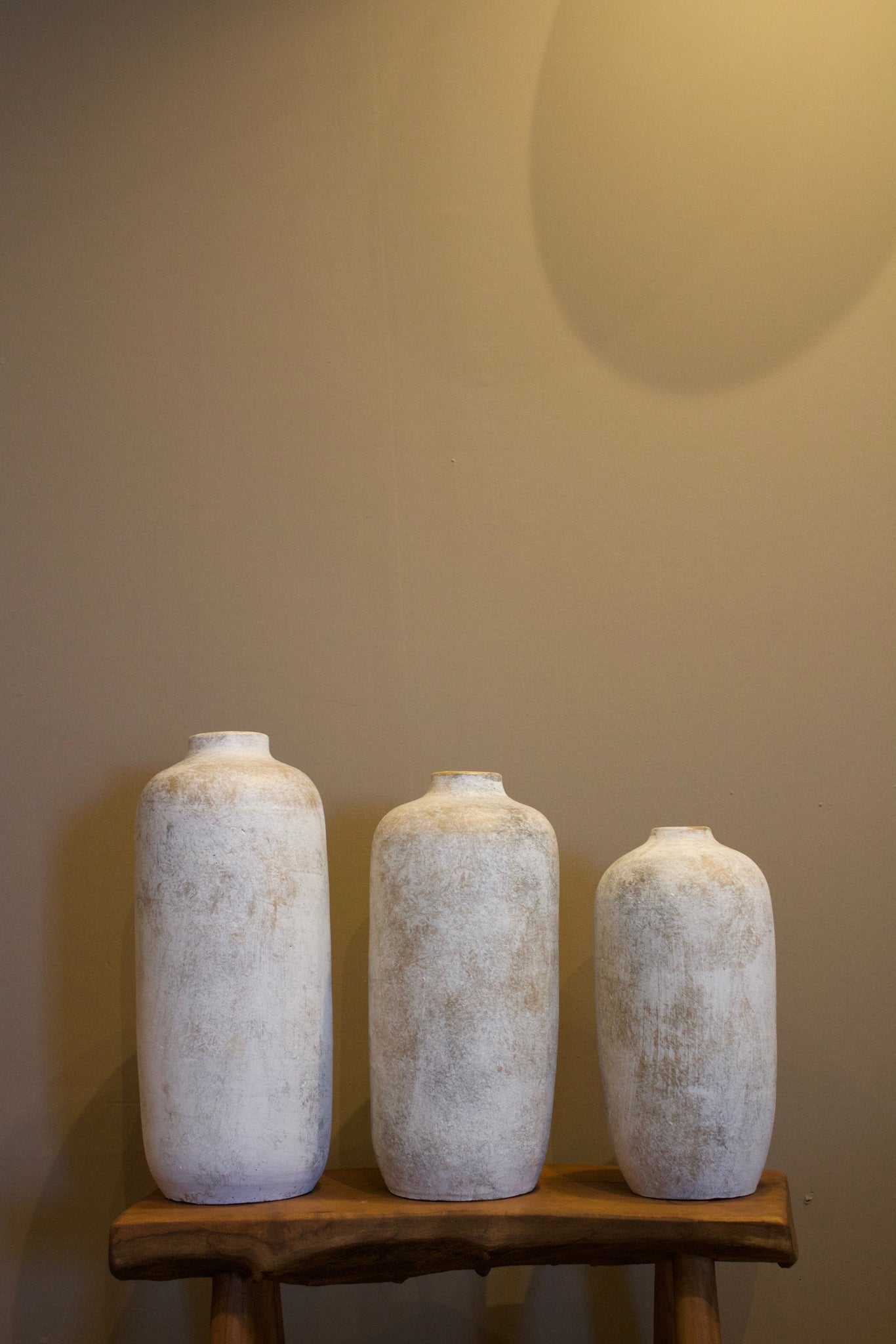Estos jarrones decorativos de barro natural ofrecen una estética elegante, minimalista y atemporal. Su silueta cilíndrica con cuello corto y su acabado envejecido en tonos beige claro los hacen perfectos para interiores neutros, costeros o contemporáneos.