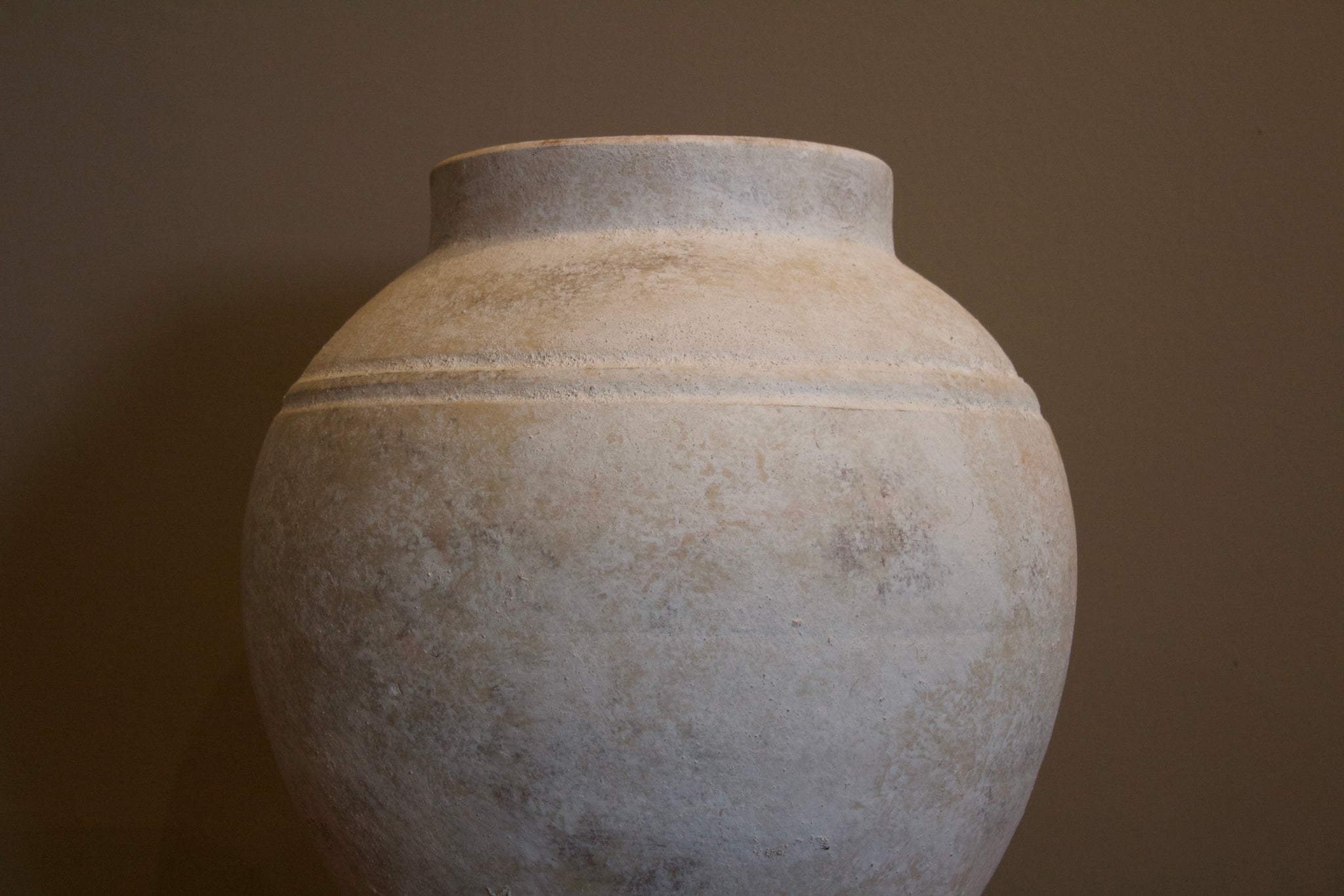Este jarrón decorativo impresiona por su silueta amplia y su acabado mate en tonos piedra natural, que remite a la artesanía tradicional con una presencia elegante y serena. Su superficie ligeramente porosa y su tono neutro con sutiles variaciones cromáticas lo convierten en una pieza sofisticada que aporta equilibrio y carácter a cualquier ambiente.