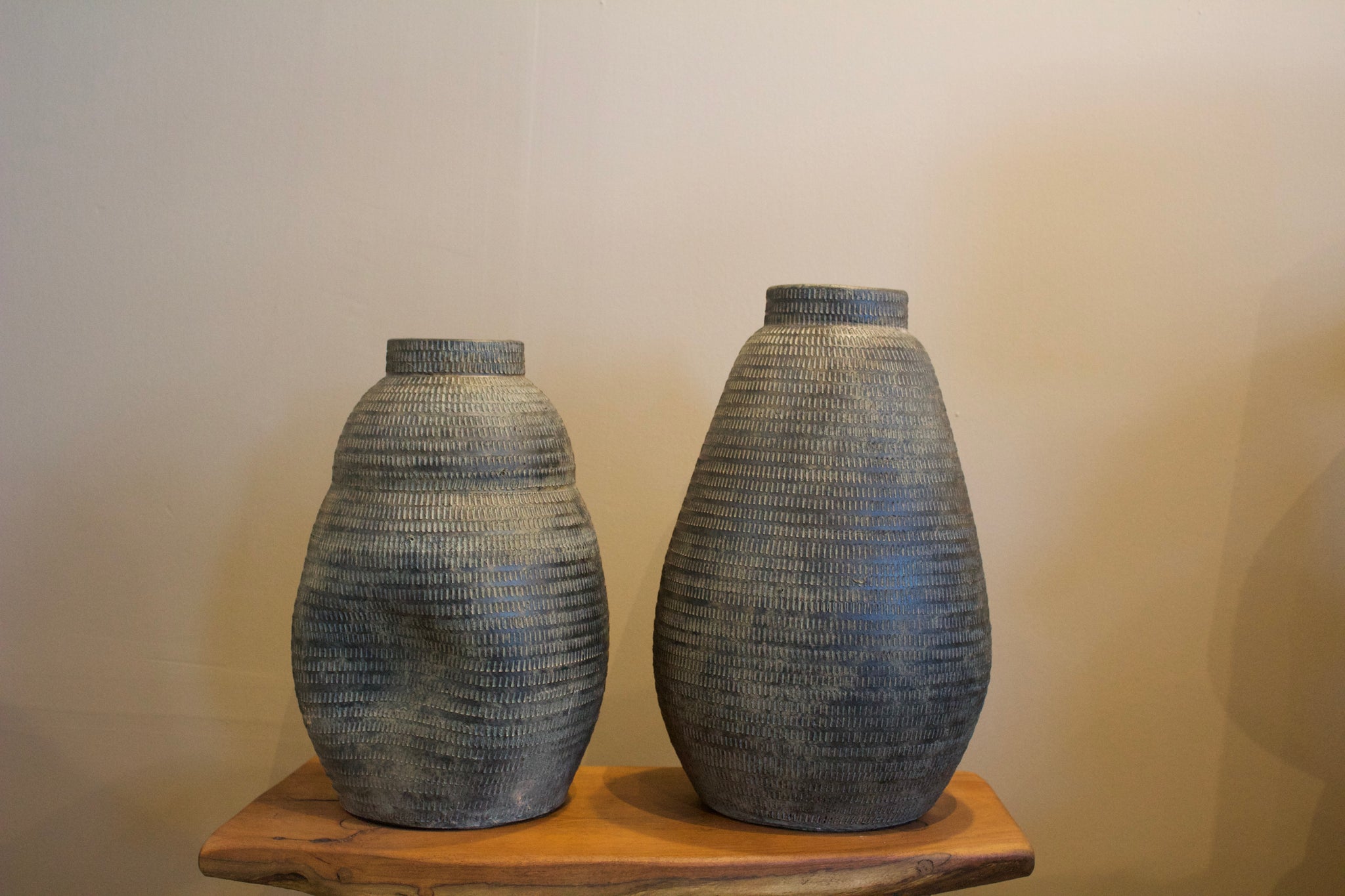 Esta colección de jarrones de barro combina formas escultóricas con una textura cuidadosamente trabajada a mano. El patrón inciso en relieve aporta carácter y movimiento, mientras los tonos oscuros con matices tierra evocan una estética natural, sobria y atemporal. Cada pieza es única, ideal para quienes buscan integrar objetos decorativos con alma artesanal en su hogar. Perfectos para usarse solos o en conjunto, ya sea con ramas secas, flores o simplemente como acento visual.