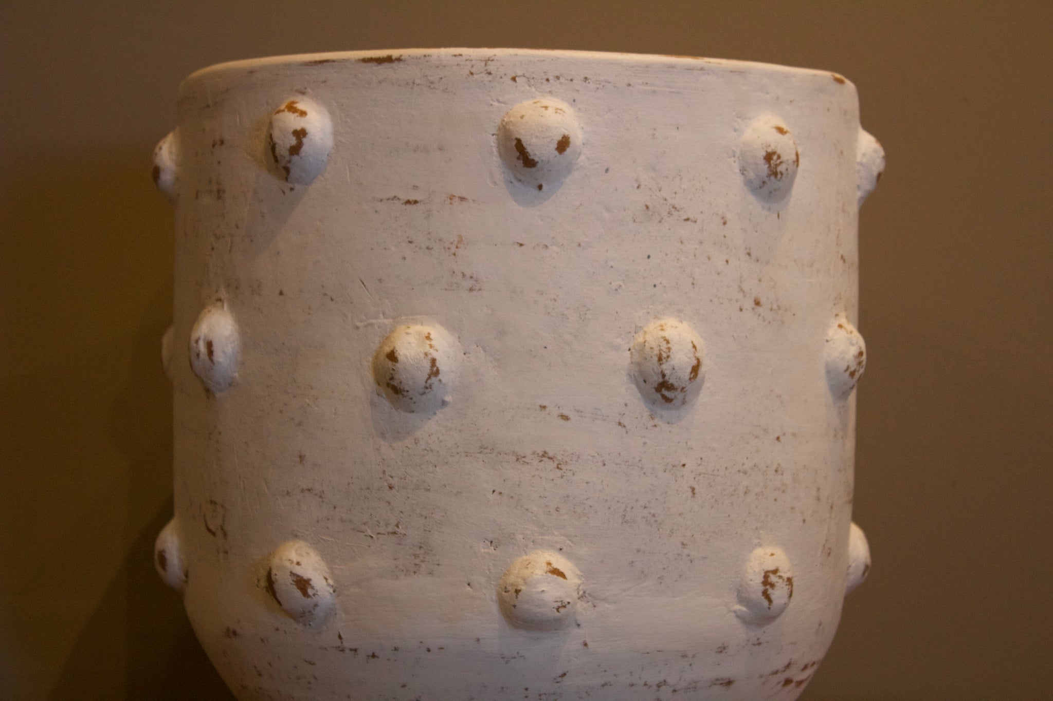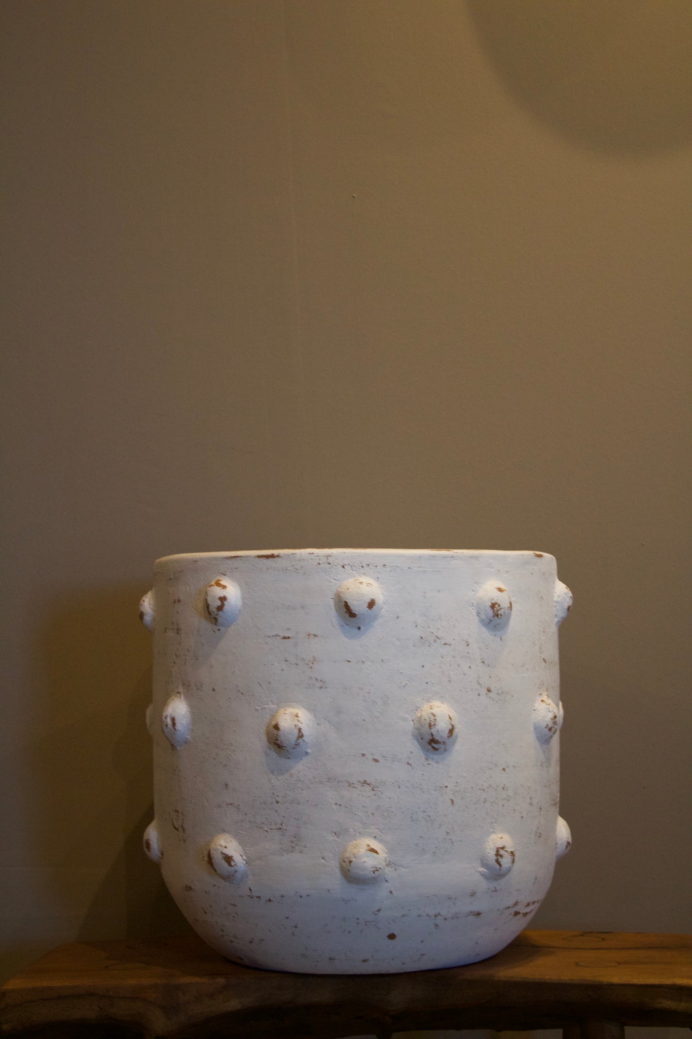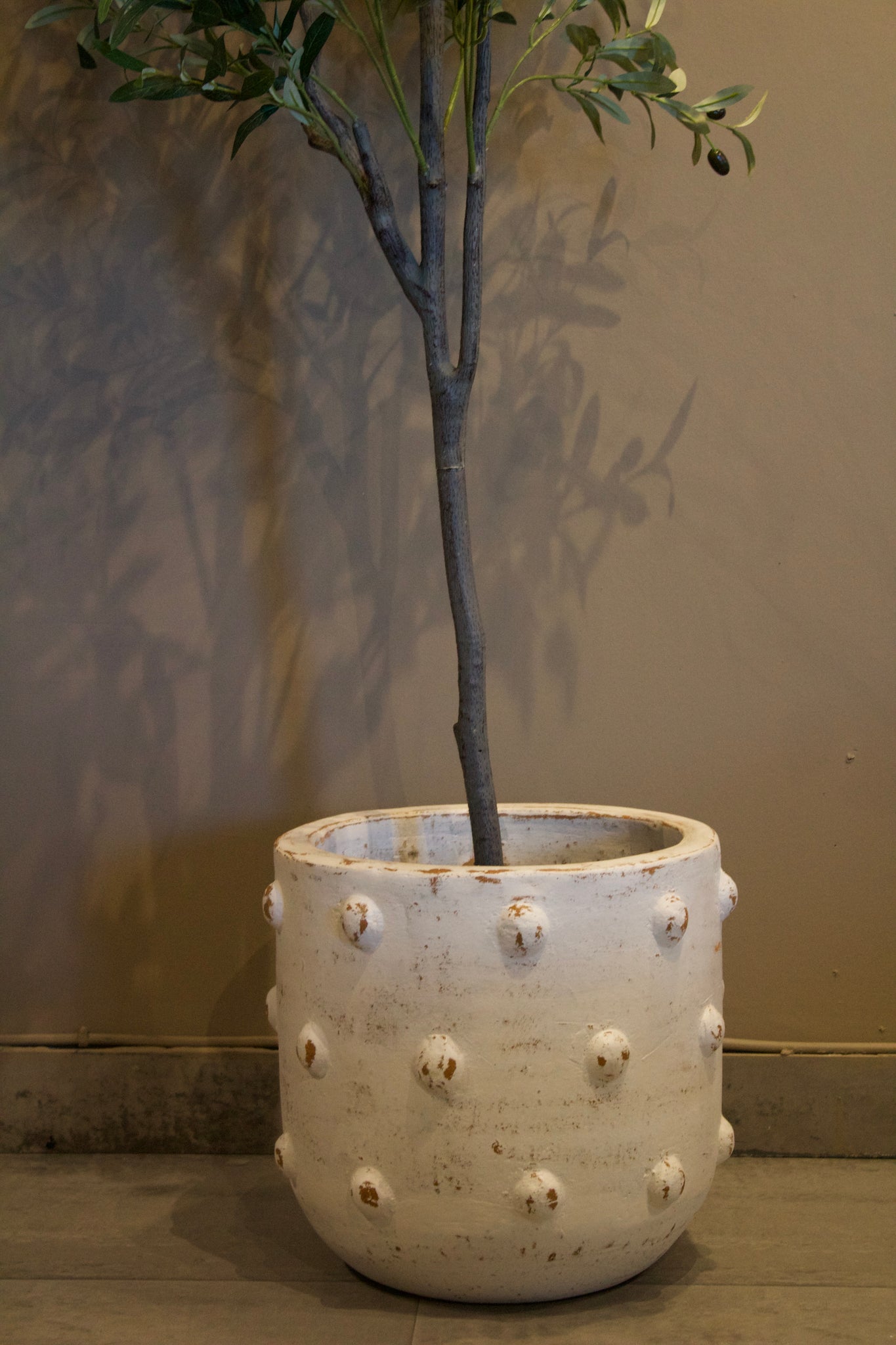 Con una estética artesanal y vibrante, esta maceta de barro combina el blanco envejecido con toques sutiles en tonos terracota, logrando un efecto desgastado muy natural. Sus relieves en forma de esferas distribuidos uniformemente aportan textura y un aire contemporáneo, ideal para quienes buscan un acento decorativo lleno de personalidad.
