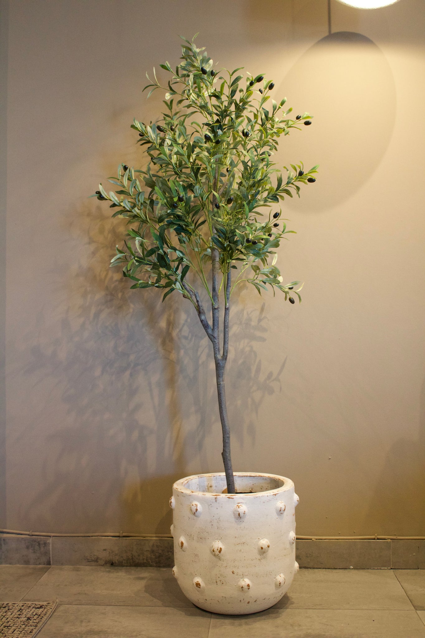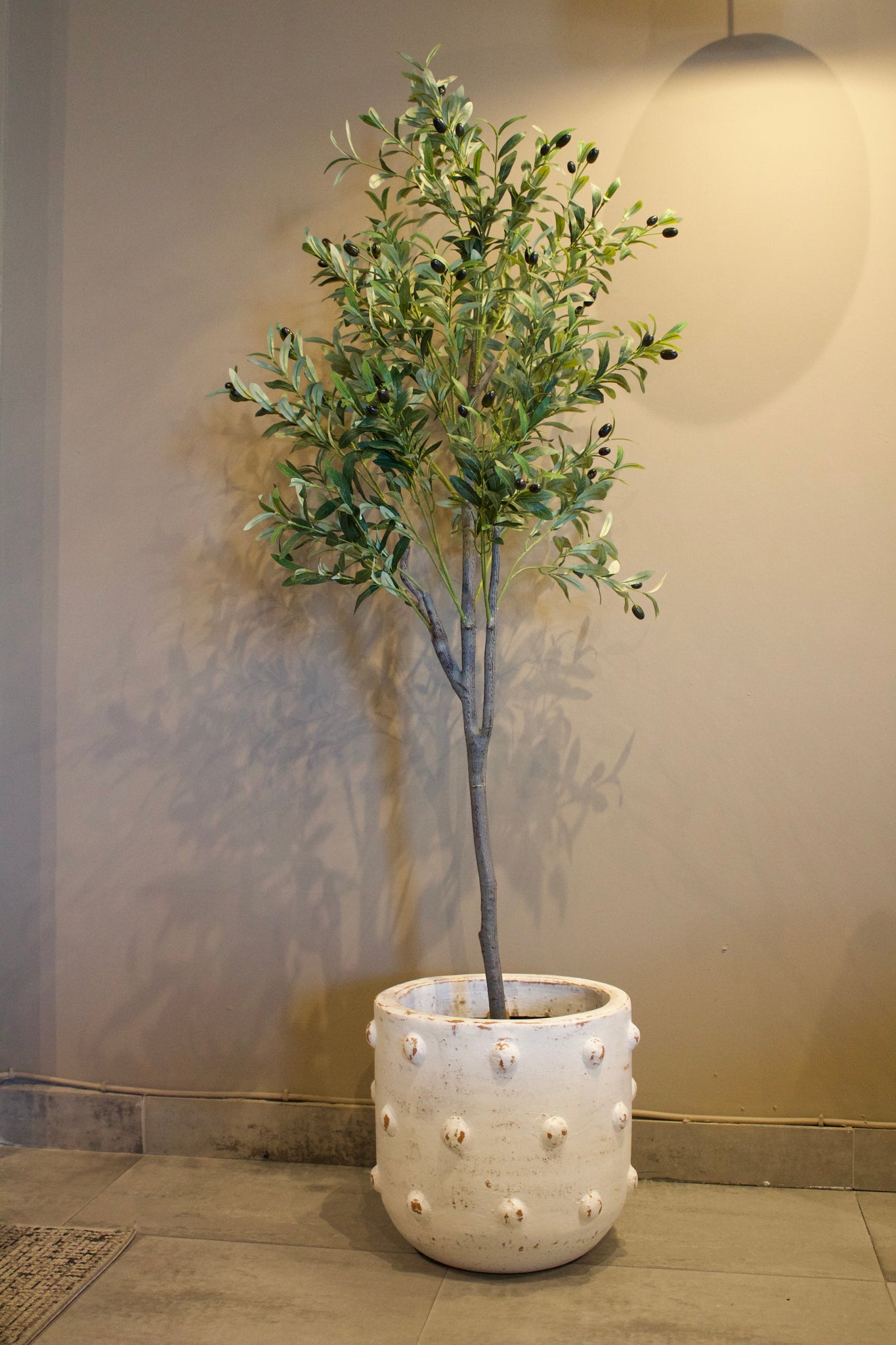 Perfecta para resaltar plantas artificiales o secas, esta maceta es una pieza que no pasa desapercibida. Su acabado envejecido y su forma robusta la convierten en un elemento clave en espacios estilo boho, mediterráneo o rústico moderno.