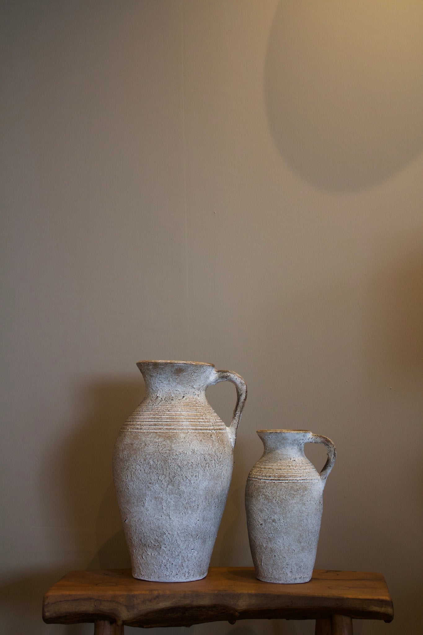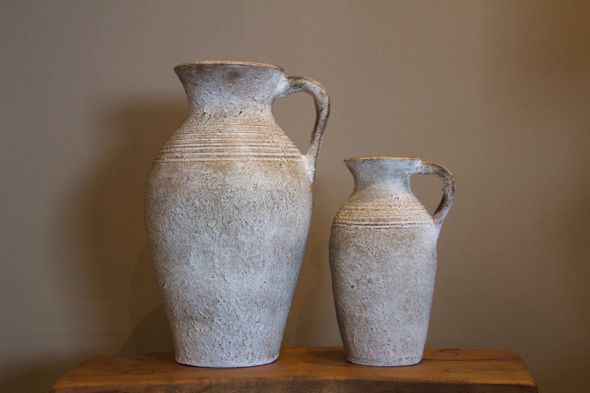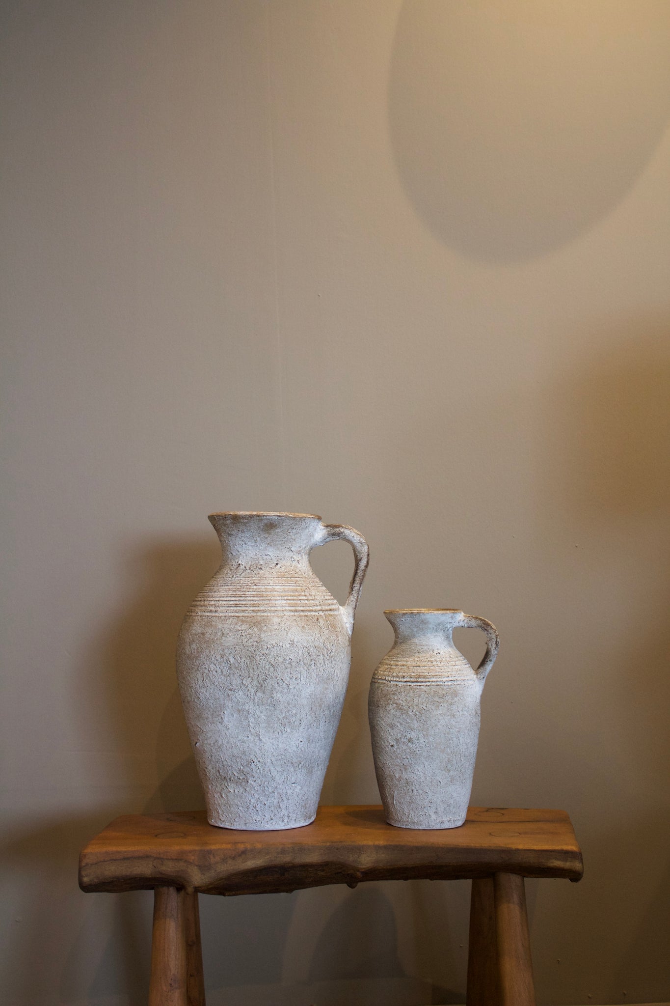 Este elegante set de jarrones de barro artesanal incluye dos piezas con forma alargada y asa lateral, inspiradas en antiguas ánforas mediterráneas. Con un acabado en tonos arena desgastados y textura rústica, aportan un toque cálido y auténtico a cualquier espacio.