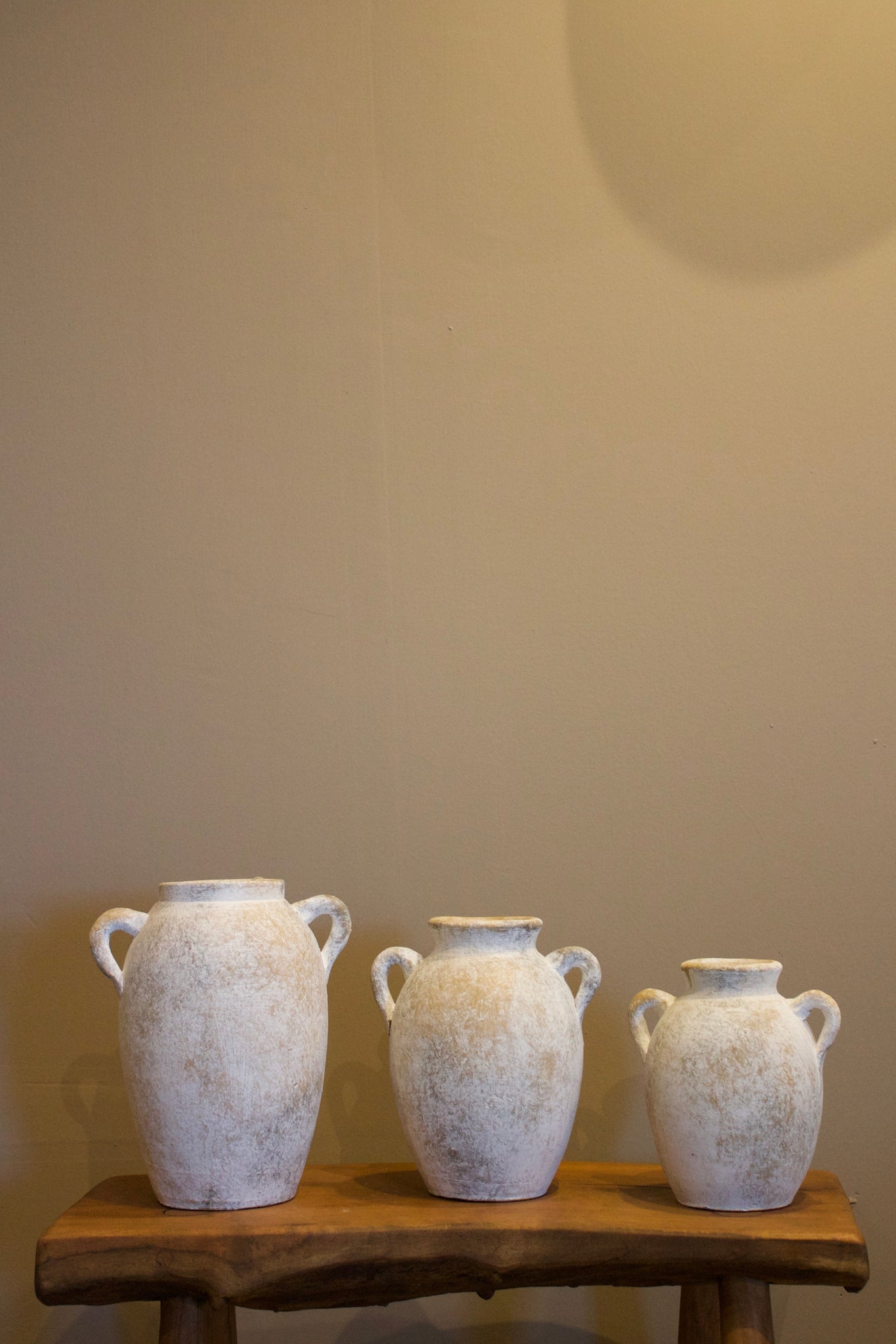 Dale un aire cálido y artesanal a tu hogar con este set de tres jarrones de barro, inspirados en la alfarería tradicional mediterránea. Su acabado envejecido en tonos beige-blanquecino y sus formas suaves con asas decorativas los convierten en un complemento perfecto para espacios rústicos, costeros o bohemios.